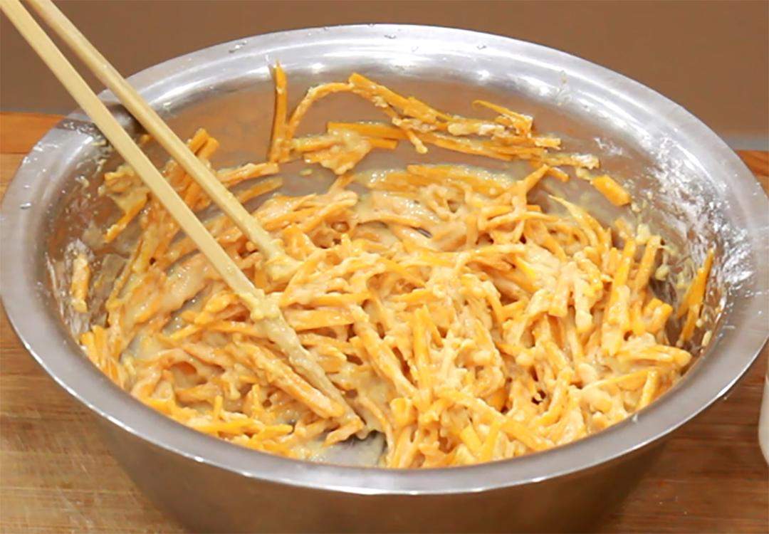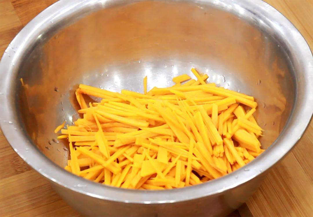 1.准备几块南瓜,削去外皮,切成细丝放入盆中。