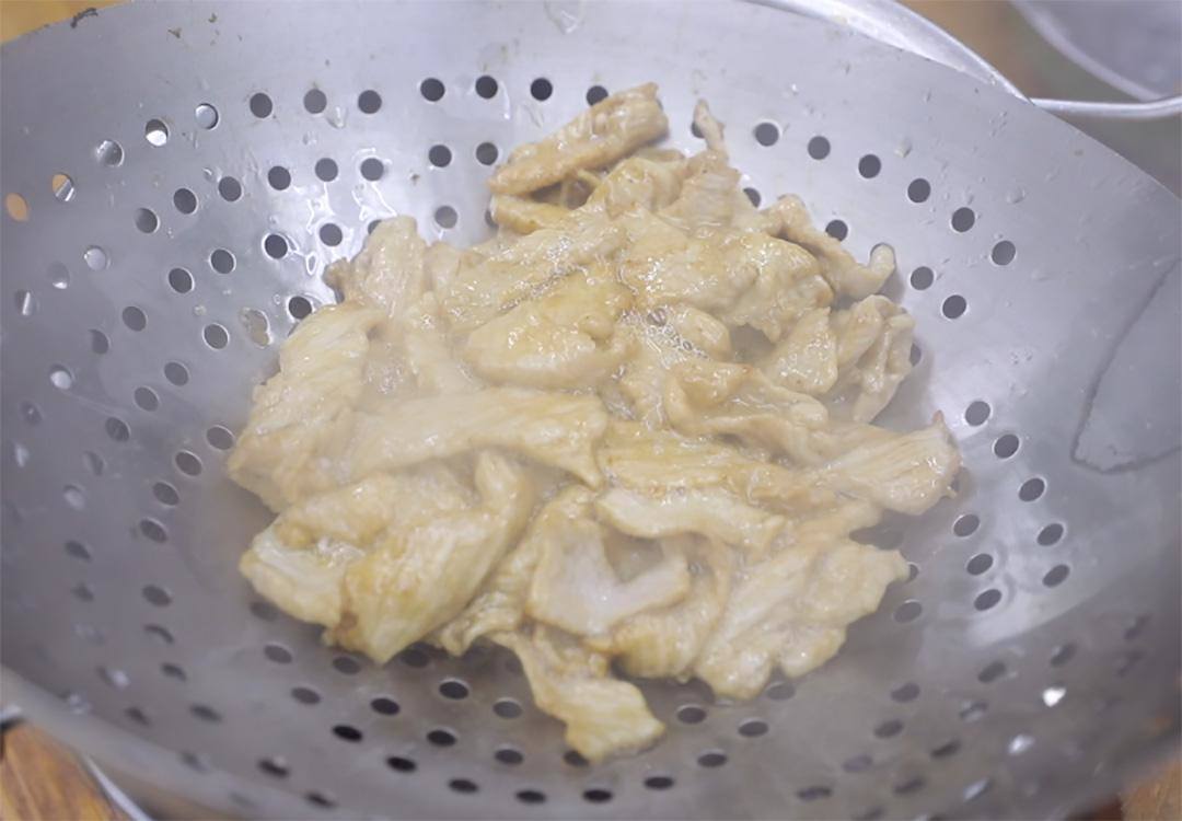 3.锅内多倒一些油,油温四成热时放入腌好的肉片,用筷子快速搅散,既能使肉片快速成熟 还能保持嫩滑,滑油的时间不要太长,30秒钟就可以了,倒出来控油备用。