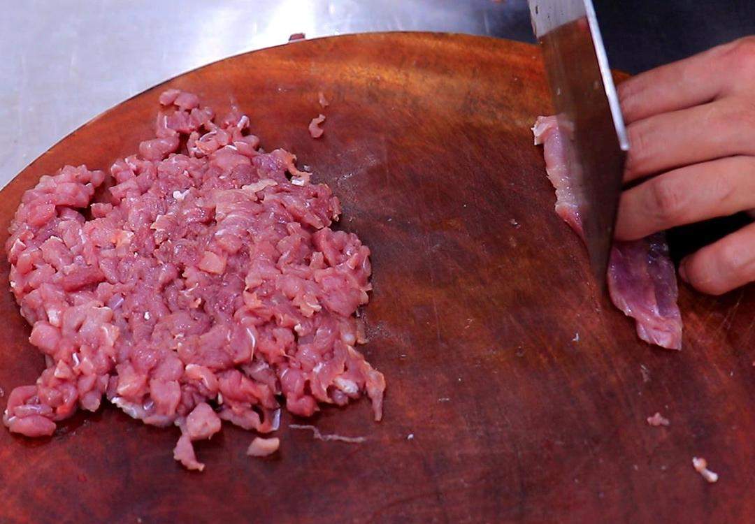 3.准备猪瘦肉300克,先切成薄片再切成肉粒。适量的泡椒和野山椒,分别切成圈。切点姜末、蒜末备用。