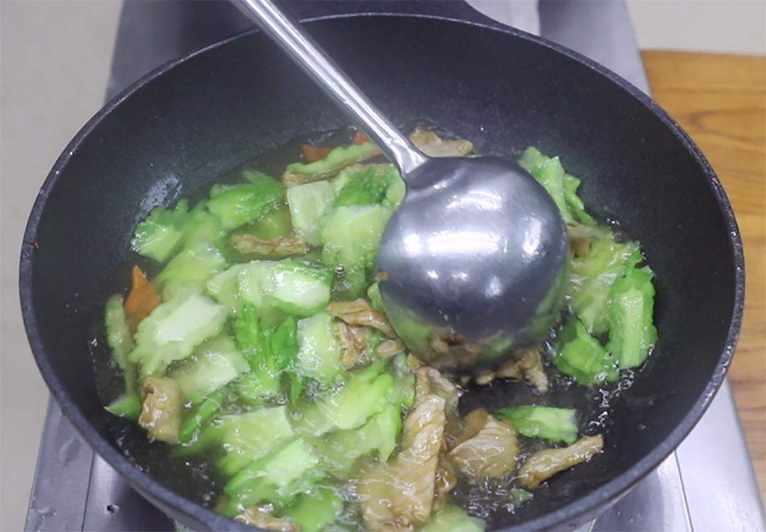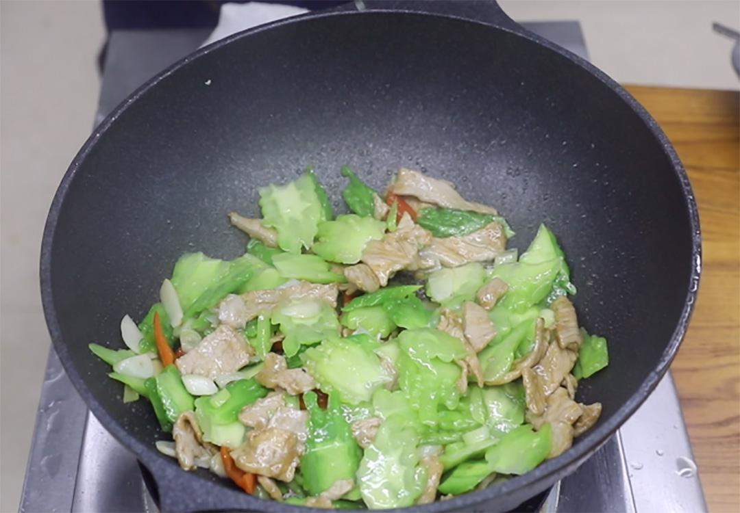5.锅内再烧油,放入葱姜蒜片爆香,沿锅边加入一勺清水,加入适量的食盐、鸡粉、味精,把调料炒散炒化,倒入苦瓜和肉片大火快速翻匀,再淋入一点水淀粉,让料汁更好地包裹在食材上面 ,翻匀以后就可以出锅装盘了。