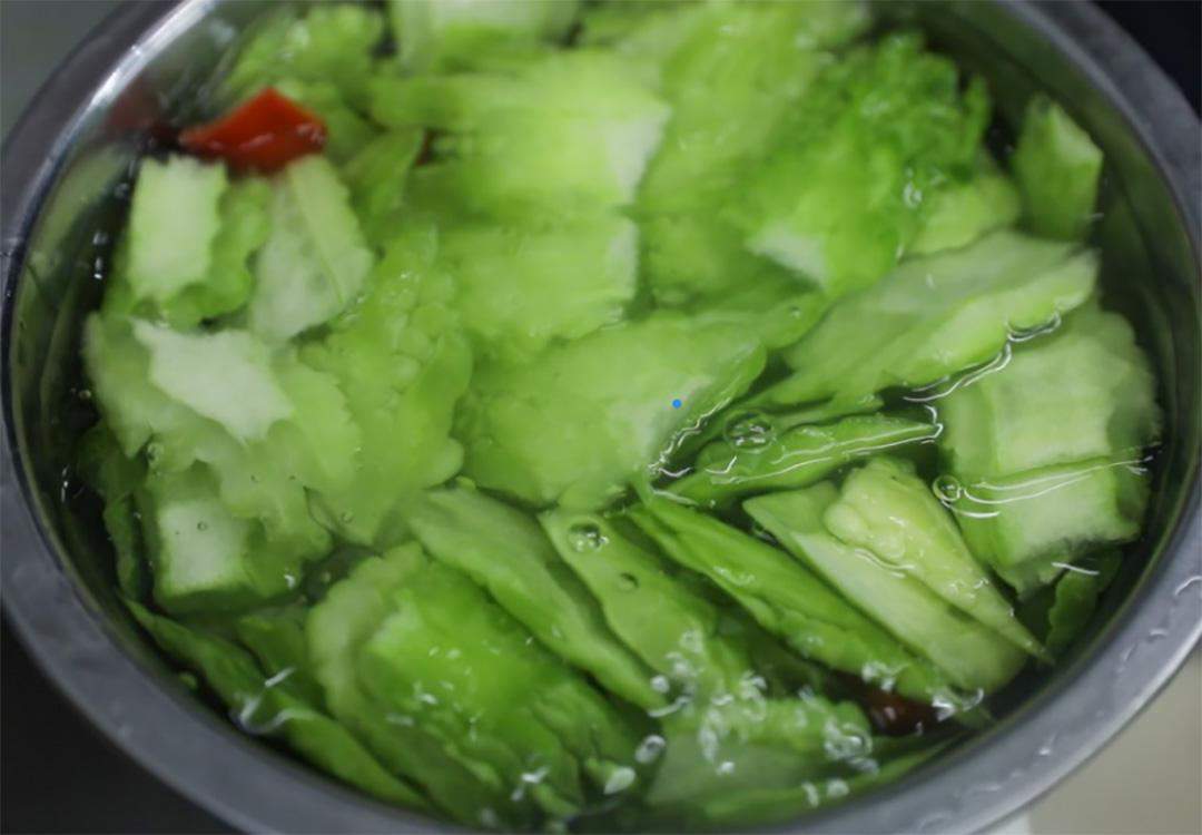 2.准备两根苦瓜,清洗一下从中间破开,去除里面的瓜瓤,处理好以后把苦瓜斜刀切成片,再切一点红椒片,用来搭配颜色。因为苦瓜的苦味比较重,再用清水浸泡10分钟,这样就不会那么苦了,口感还清脆。
