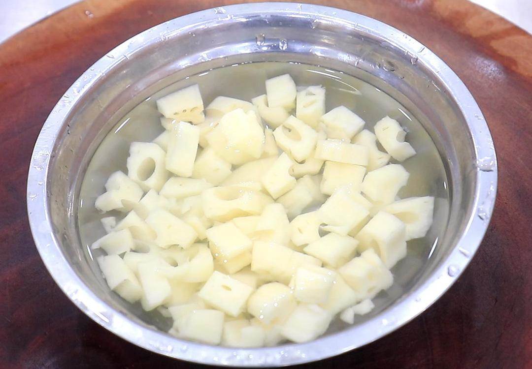 1.准备一节莲藕,把外皮削干净,先切成厚片,再切成均匀的小块放入清水中,把上面的淀粉洗干净后再换清水,加入少许白醋浸泡一会儿,以免氧化变黑。