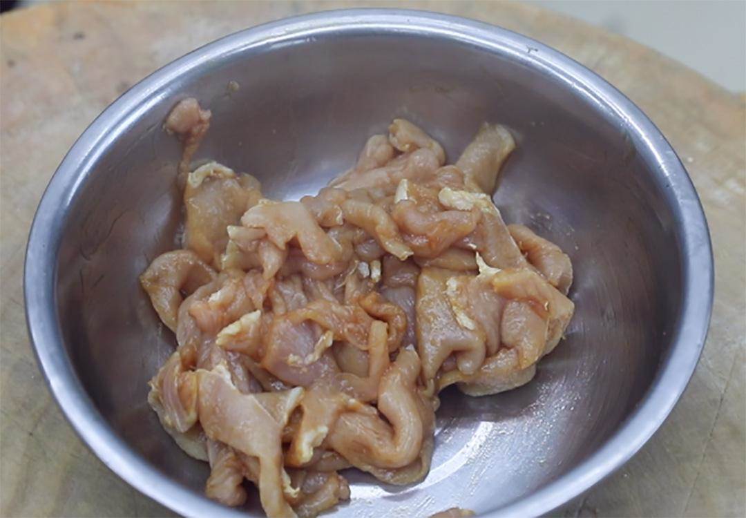 1.准备一块里脊肉,去除猪皮切成均匀薄片,切好以后放入碗中,加入适量的蚝油、食盐、鸡粉、胡椒粉、生抽,抓拌均匀给肉片码地底味,再淋一点老抽上色,把肉片抓拌至出胶发黏,加入一些水淀粉继续抓拌摔打一会儿,再淋入一点植物油锁住水分,腌制10分钟。