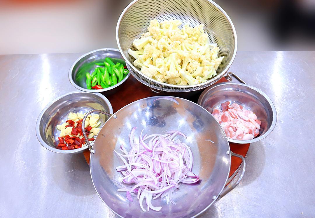 1.准备花菜一大朵,去除硬根,切成小块,放入清水中洗干净。适量的小米椒和线椒,洗干净以后分别切成段。大蒜一小把,切成蒜片放入碗中,再抓入一小把干辣椒备用。五花肉一小块切成薄片。洋葱半个,切成片用手打散,放在干锅中垫底免得糊底。