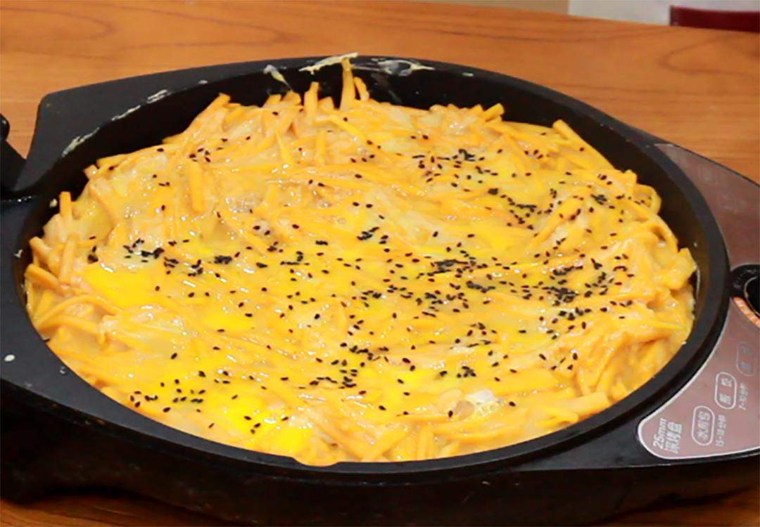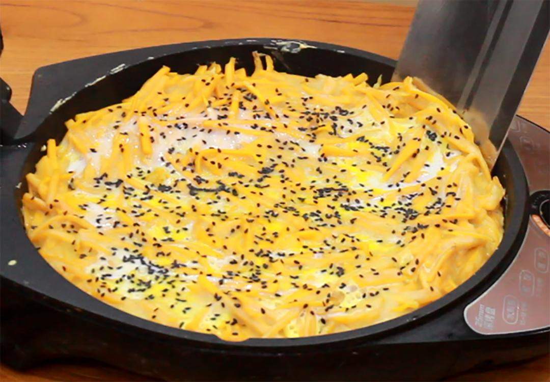 3.起锅开小火,均匀刷上植物油,油温五成热时,把馅料倒入锅中,摊成薄厚均匀的圆形面饼,盖上锅盖烙3分钟,烙制面糊全部定型,在上面打入一个鸡蛋,把蛋液刷均匀,再撒上一层黑芝麻,盖上锅盖再烙1分钟。