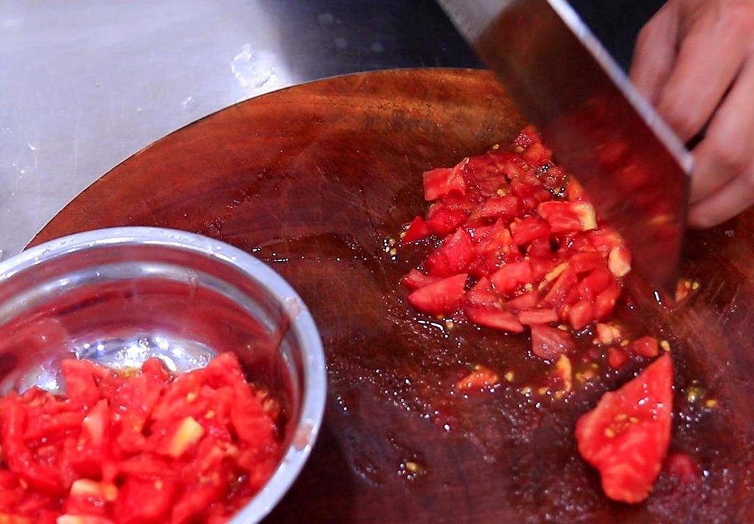 2.准备番茄一个,打上十字花刀 ,放入开水中烫一会儿,烫破皮以后取出来,稍微晾凉一些,剥掉外皮切成番茄丁。