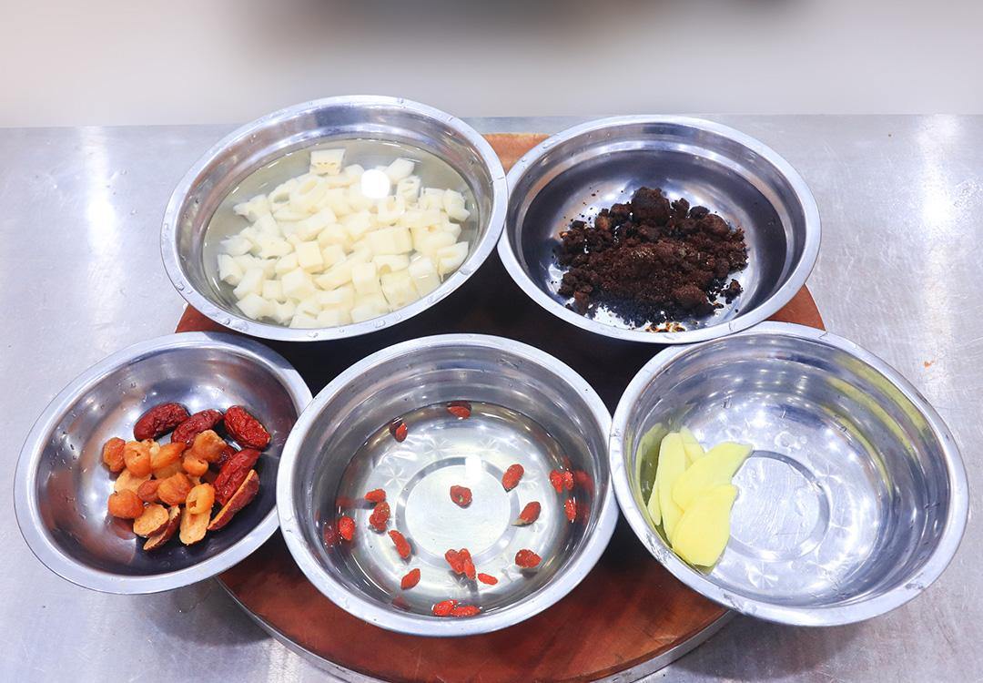 2.准备适量的红枣、桂圆,分别用清水洗去上面的杂质。一小撮枸杞用清水浸泡一会儿。适量的红糖,再切点姜片备用。