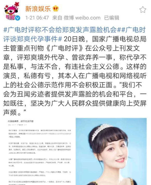 1月21日,正式迎来了广电封杀郑爽的消息: