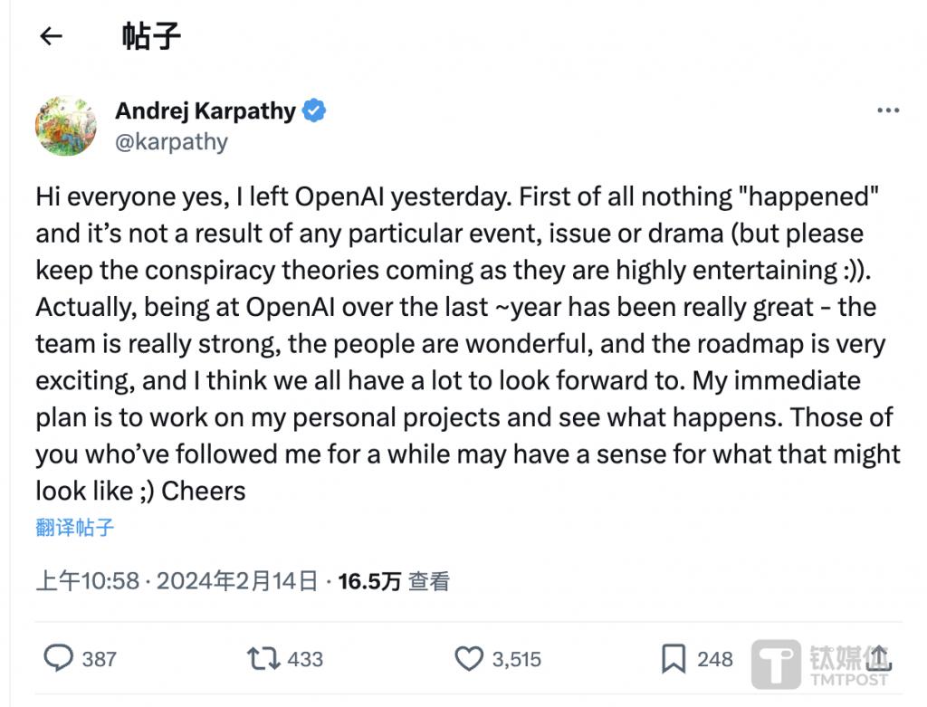 钛媒体 App 2 月 14 日消息,今天上午,OpenAI 发言人证实,OpenAI 创始成员之一、公司 AI 技术研究员安德烈 · 卡帕蒂 ( Andrej Karpathy)已离开公司。
