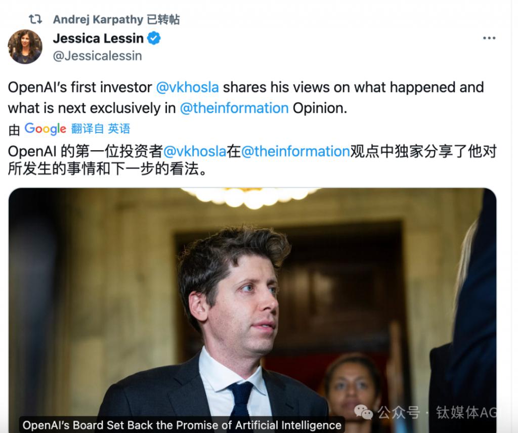 事实上,去年 11 月,OpenAI CEO 奥尔特曼(Sam Altman)被 OpenAI 非营利母公司董事会罢免后,多名技术人员离职。然而,董事会改变决定后,这些员工与奥尔特曼一起回到了公司。当时,卡帕蒂转发了一条 The Information 报道推文—— OpenAI 董事会对 AI 技术发展做出了错误的预判,而错误的董事会可能会损害公司。