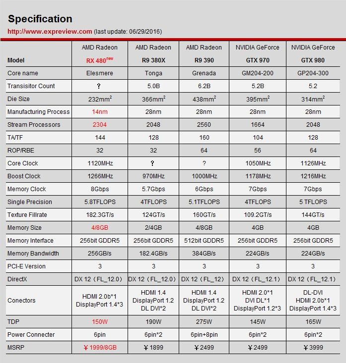 RX 480规格对比