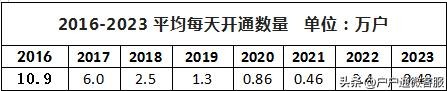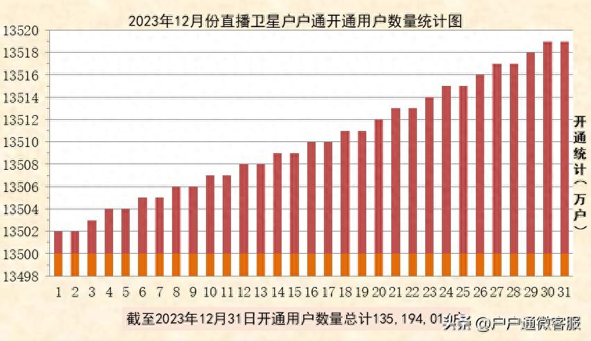 根据国家广电总局发布的户户通用户开户统计数据图计算,截止2023年12月31日全国户户通累计开通用户数量总计13519万户,本月新增18万户,平均每天开通0.58万户。
