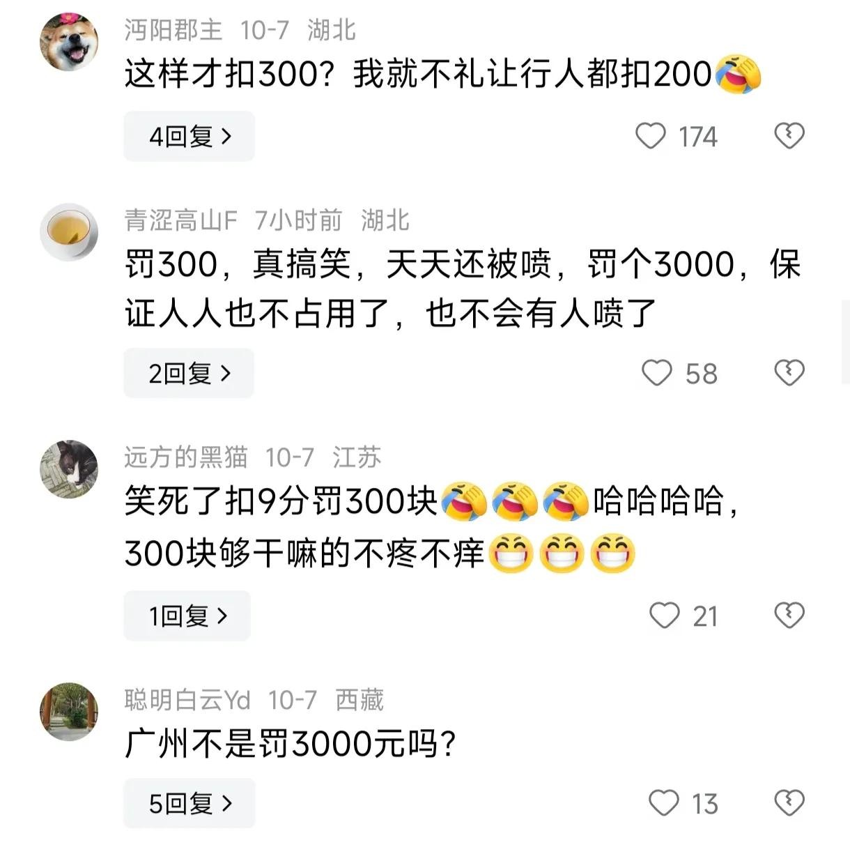这一处罚结果迅速在网络上引起了热议。许多网友纷纷表示,对于如此严重的交通违法行为,仅仅扣9分、罚款300元的处罚力度显然不够。有网友直言:“这样才扣300?我就不礼让行人都扣200!”还有网友调侃道:“笑死了扣9分罚300块,哈哈哈哈,300块够干嘛的不疼不痒。”更有网友质疑:“广州不是罚3000元吗?”
