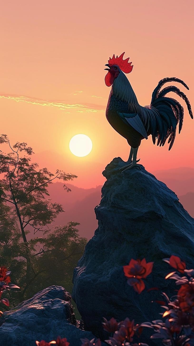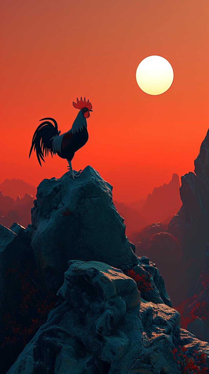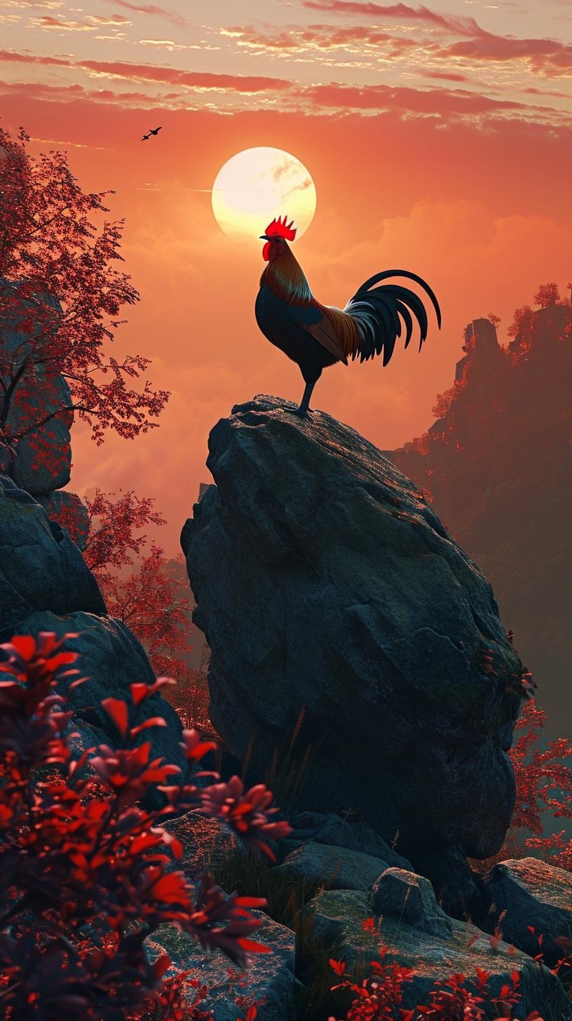 一轮红日高高挂,此时的公鸡具有“破晓东方”般的寓意。
