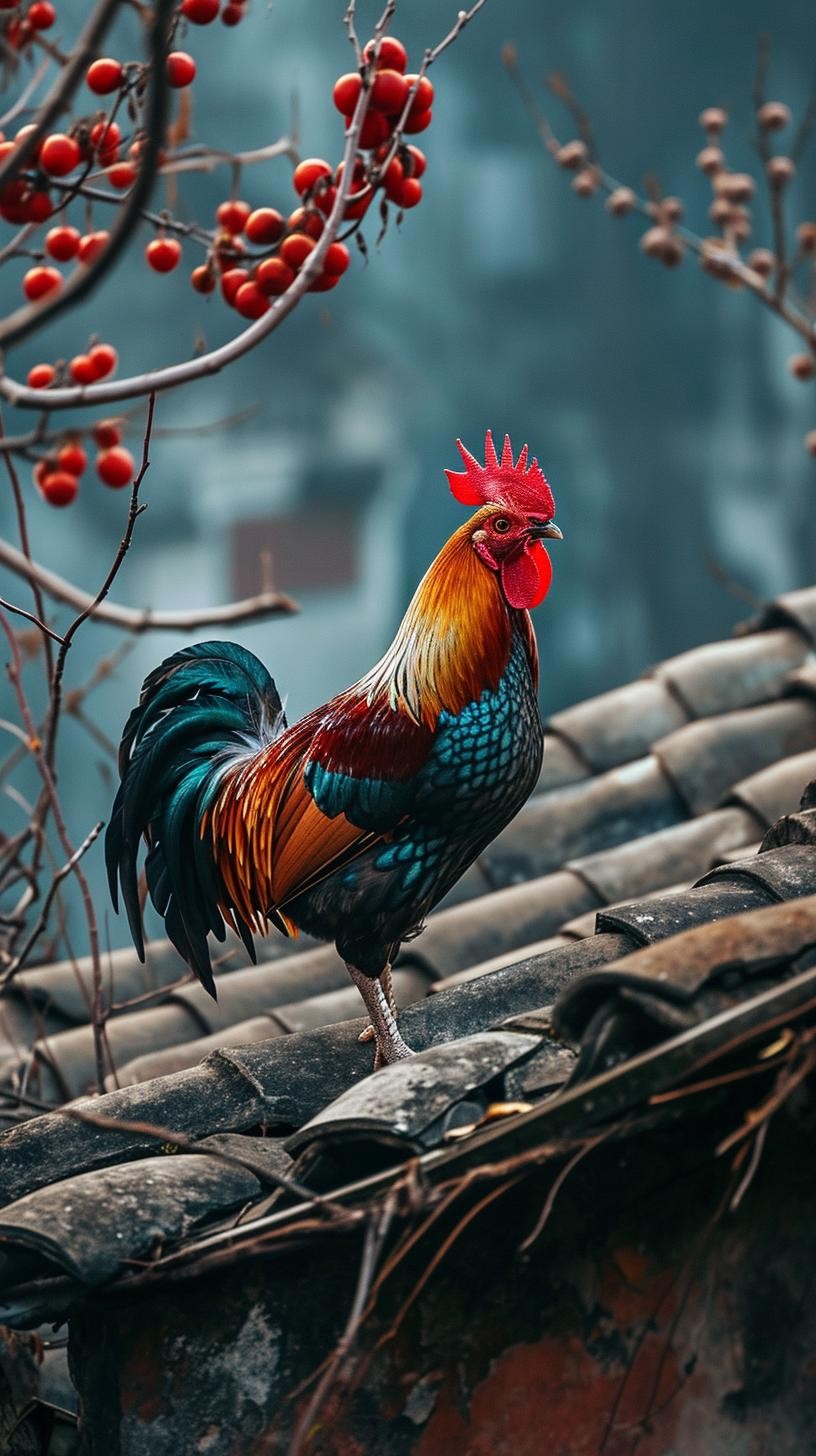 构思这组壁纸的时候,我将大公鸡创作于乡村的屋顶,矫健的大公鸡有一定的飞行能力。而大公鸡也喜欢在高处啼鸣,因此,在乡村,大公鸡在屋顶啼鸣的场景也不少见。