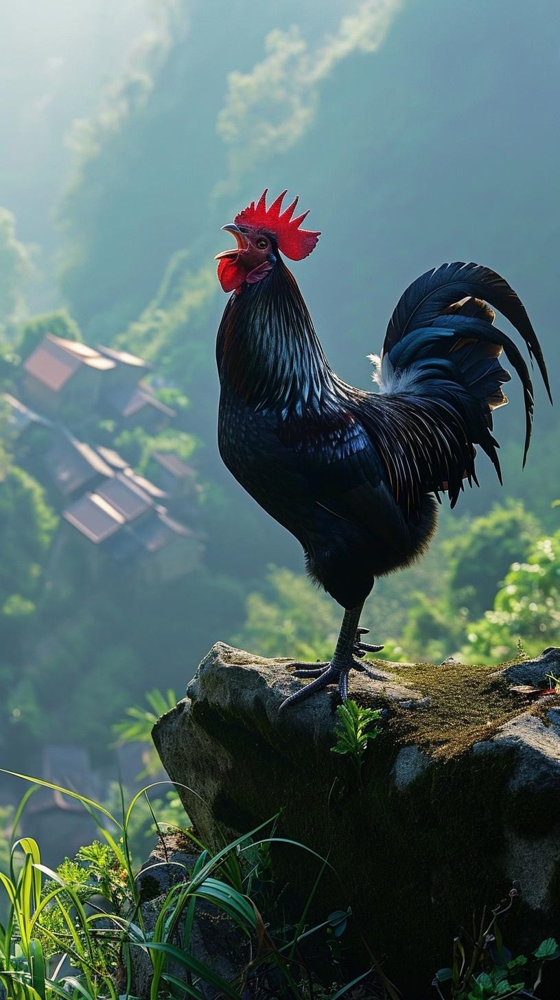 一轮红日,从东方缓缓升起。阳光还没那么灼热的时候,大公鸡昂着它高傲的脑袋,红红的鸡冠比那天边的红日还要红。