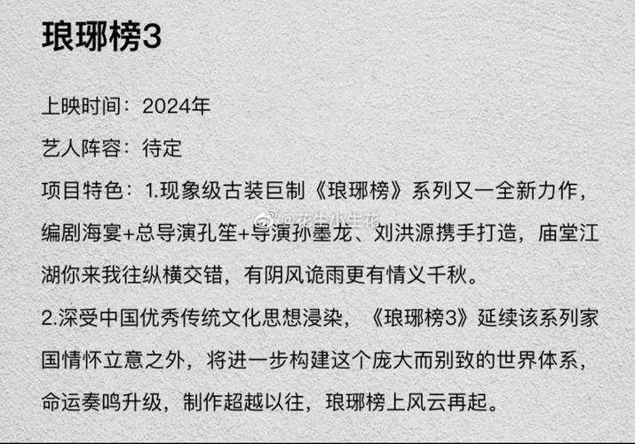 我们期待着孔笙导演和他的团队能够给我们带来更多的惊喜和感动,也期待着这部剧能够延续《琅琊榜》系列的辉煌。