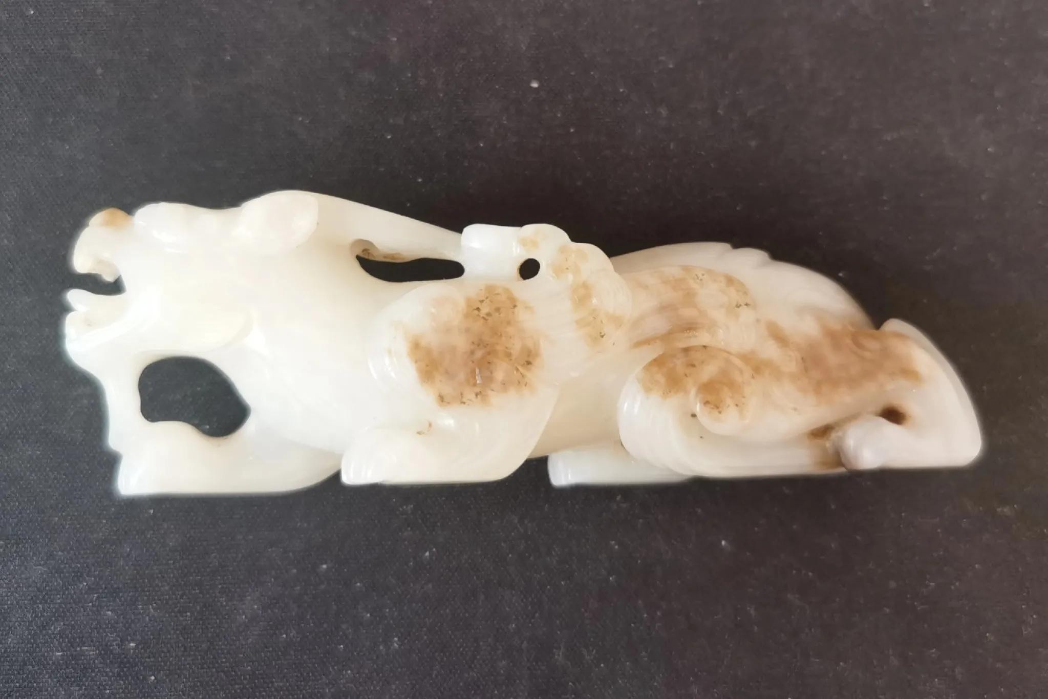 是早期较为优秀的作品,此兔四肢蜷卧,缩颈闭口食状,形态稚拙可爱,也是少见的铜镇纸。瑞兽玉镇纸,