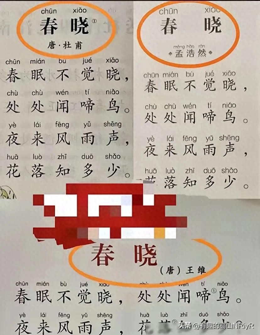 近日,在为孩子辅导功课的时候,竟发现了一个令人诧异的现象:对于经典古诗《春晓》,不同的教材上居然出现了不同的作者标注。有的写着王维,有的写着杜甫,而我们一直熟知的明明是孟浩然所作。这真的让我感到十分困惑和震惊。