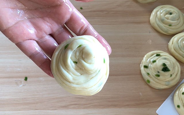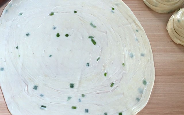 第四步:取出休息好的面团,不要揉,整成条切剂子,把剂子拉开后擀薄或者整薄。然后抹上葱油,像折扇子一样折好,再边拉长边卷,最后把尾巴收好。再次松弛10分钟左右