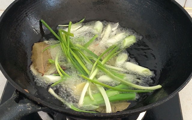 第二步:熬制葱油。准备青葱、老葱头、姜片、一个八角、两片香叶、一根大葱,锅烧热后加入食用油,待油温微微热放入所有配料小火慢熬,期间多翻动让受热均匀。炸至葱变焦黄,然后捞出杂质,把熬好的油放凉备用