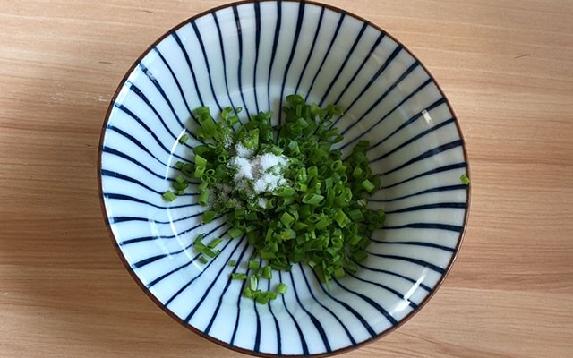 第三步:把葱切成葱花,根据个人口味加入少许盐和五香粉,再倒入少许晾凉的葱油,拌匀备用