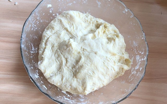 第一步:把400克普通面粉放进大碗中,再加入2克盐,打入一个土鸡蛋,稍加搅拌后,加入适量80度的热水和面,搅拌成絮状后,加入15克放凉的熟油,然后揉成团,盖上盖子让面团松弛一个小时。(也可以在碗中抹一层油,这样方便松弛好的面团取出)