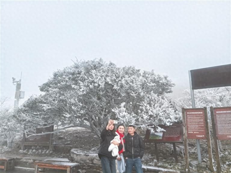 梵净山银装素裹,游人拍照打卡。 贵州日报天眼新闻记者 阙成岱摄