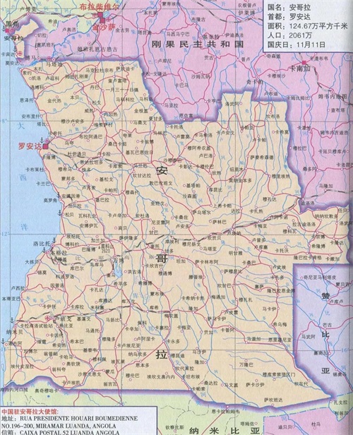 安哥拉,位于非洲西南部,这是一个总面积124万平方千米的国家,人口约3560万人。卡宾达是安哥拉最北边的一个省,位于刚果河入海口北岸,夹在两个刚果之间,与安哥拉本土隔开了一段,是属于安哥拉管辖的飞地。