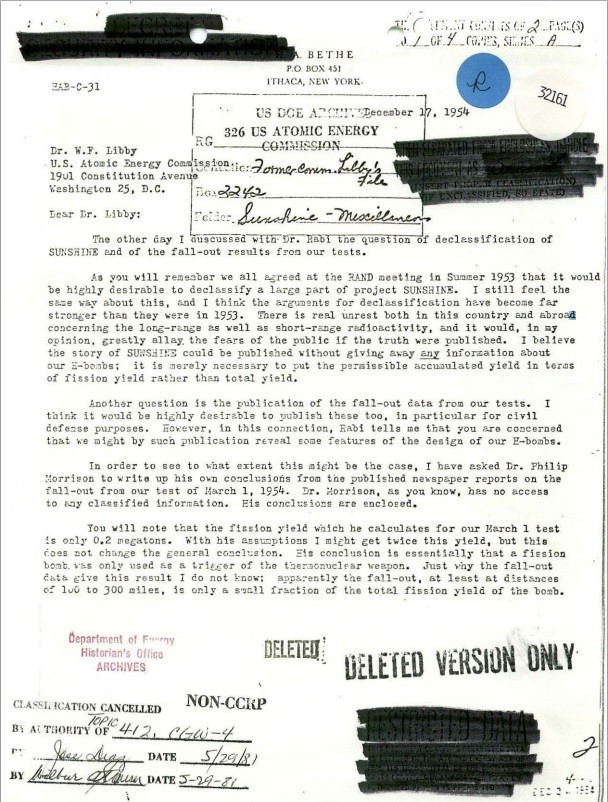 1953年,美国原子能委员会和美国空军实施了“阳光计划”(Project Sunshine ),宣称是为了确定发生核爆炸或意外放射性爆炸时,核辐射对人类基因库的长期影响。因为之前,核科学家已经确定,地面上的核试验对人类的遗传造成了损害。而测量核辐射对人类基因的影响程度最简单的方法,是检查那些暴露在核辐射环境的人的骨骼和牙齿。
