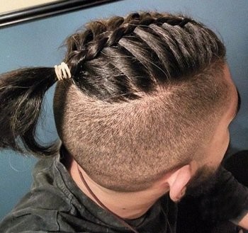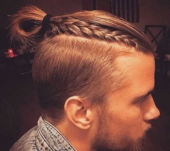 2016年男生剃两边发型很是流行,侧边发丝全部剃成了板寸,清爽极了,而头顶发丝则留的长长的,长发与短发的完美结合,造就男生潮流时尚,男生将头顶两边的长发编织成向后的精致侧蝎子辫,发尾与中间的长发一起在发旋位置扎成简单丸子头,一款个性创意男生剃两边侧蝎子辫编发发型,非常的吸引眼球呢。