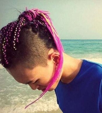 两侧边发丝全部剃成光头,而头顶与脑后的发丝很长,梳着这样发型的男生们,编头发的时候可以在发丝中添加彩色丝带哟,长发与彩带一起编织成一个个小小的辫子,最后的发尾聚集在发旋位置扎成高马尾辫,粉嫩鲜亮的男生露额彩带编发发型,你敢尝试吗?
