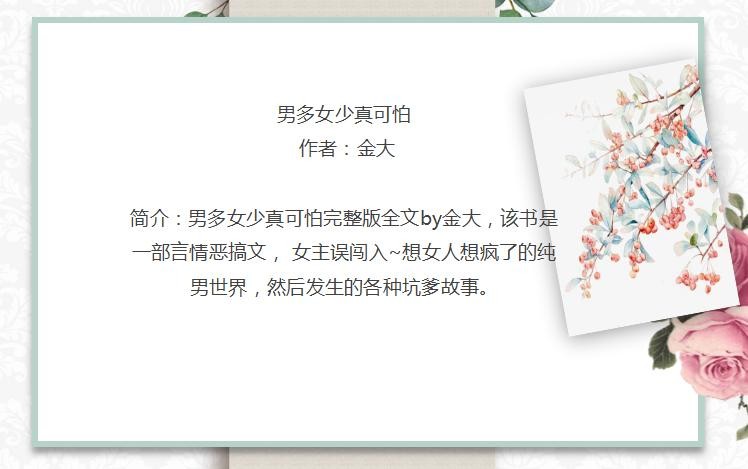 简介:男多女少真可怕完整版全文by金大,该书是一部言情恶搞文, 女主误闯入~想女人想疯了的纯男世界,然后发生的各种坑爹故事。