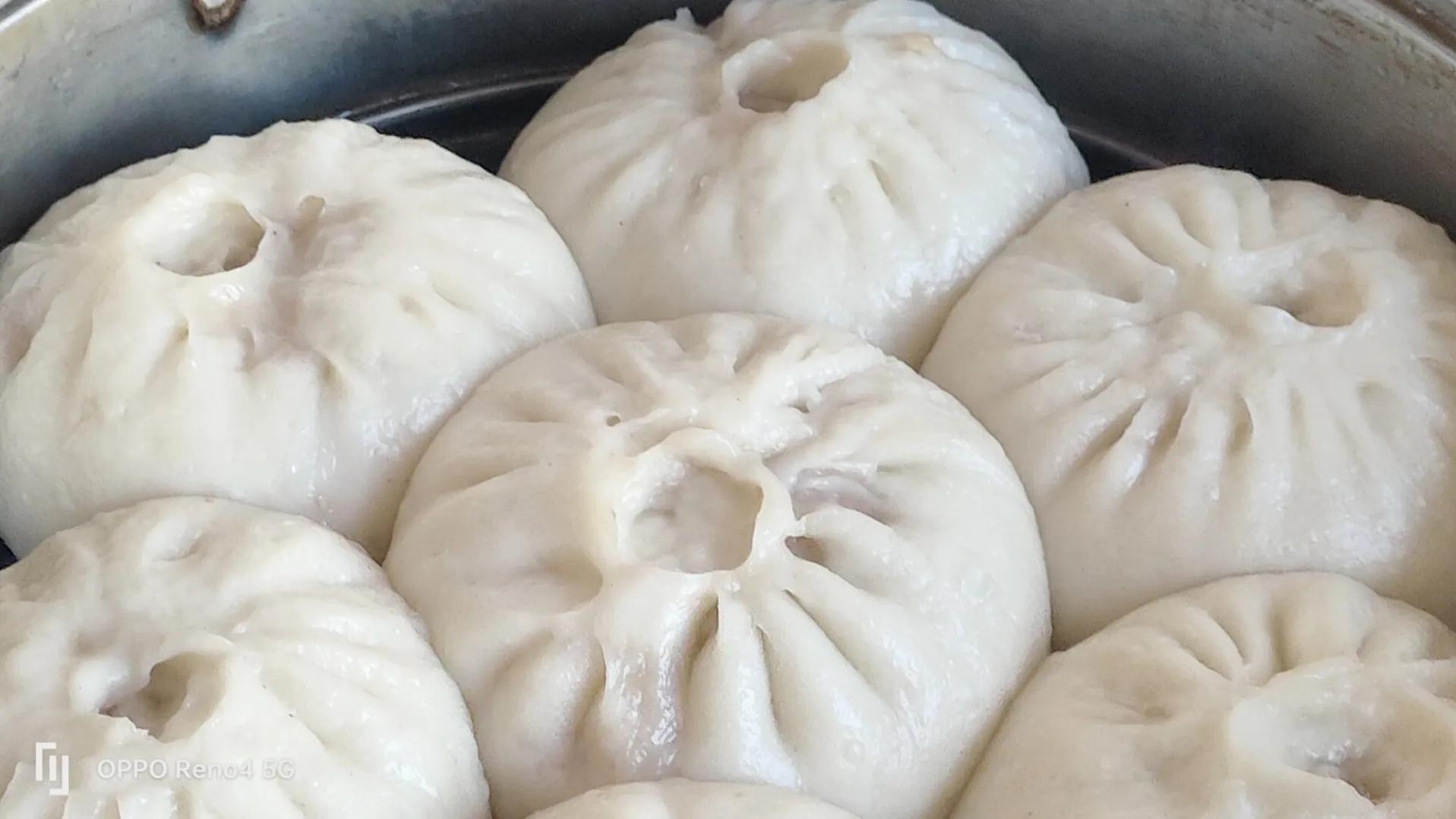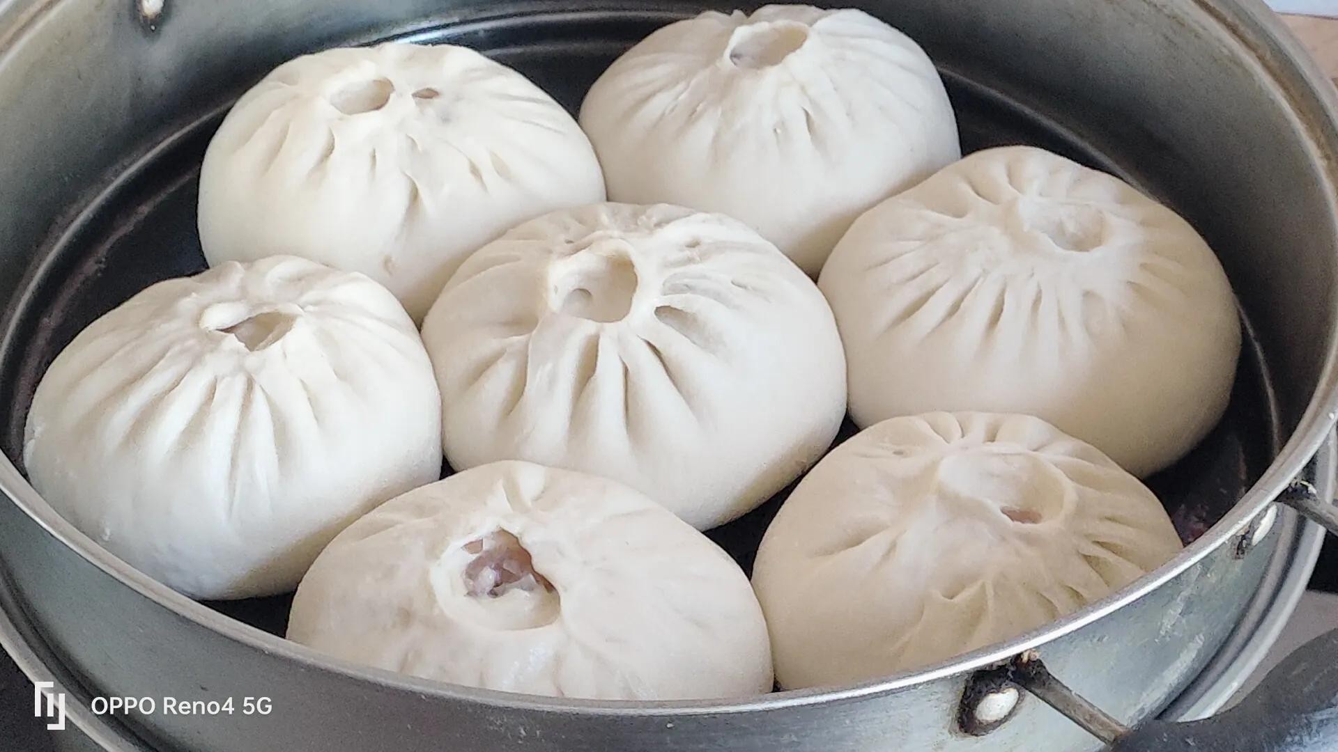 哎呀!一出锅,个个像个白胖子。包子蓬松喧软,鲜香入味,满屋飘香。