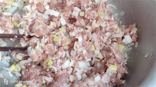 4,肉馅中加酱油,生抽,姜末,适量食盐,五香粉适量,大葱可多些。用炸花椒的热油炸一下葱,葱香味就出来了。这是肉馅葱香浓郁的关键。所有食材搅拌均匀即可。最后加香油增香。