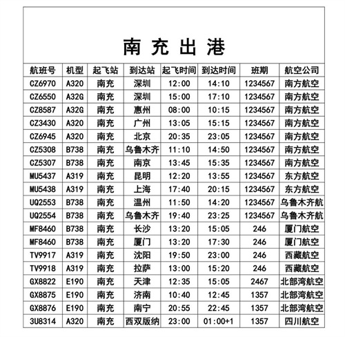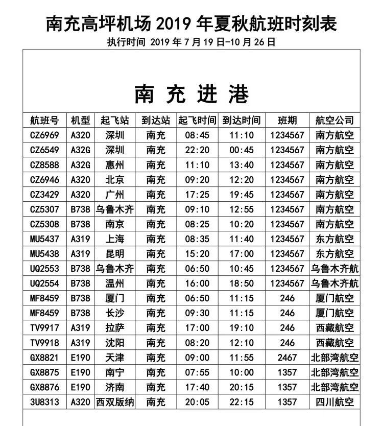 南充高坪机场2019年夏秋航班时刻表出炉——