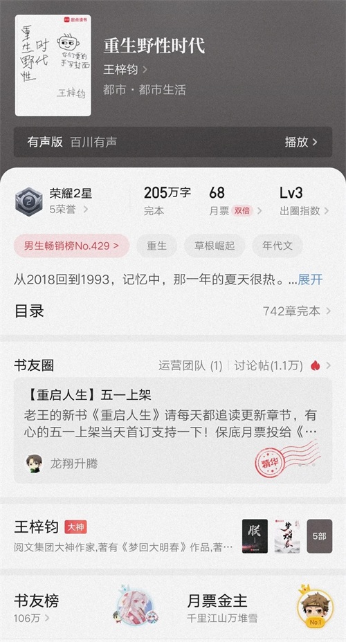 你是否厌倦了千篇一律的套路文?有没有一本小说,既能让你笑出腹肌,又能让你热血沸腾?王梓钧,这位起点中文网的“现象级”作家,用“重生+穿越”的双杀组合,硬生生把历史文和年代文玩成了“开挂爽文”。他的作品没有狗血恋爱,没有无脑打脸,却总能用“野性时代”的荒诞与“大明春”的权谋,让人一口气读到天亮。今天,我们就来聊聊这位“文坛老炮”的5本封神之作,看看他凭什么让读者从2018年追到2025年!