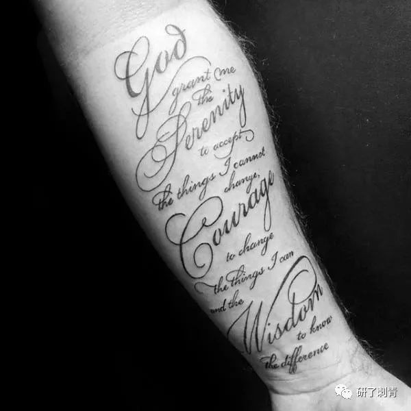 前臂的位置很适合“文字”纹身。这是因为有足够的空间来容纳较长的单词和短语。你最喜欢的歌词,电影台词,或者智慧的话语都可以使你的笔墨变得强大而有意义。在纹身的时候,简单的字母会让纹身更容易读懂。与此同时,草书或书法可以给你的艺术一个独特的外观,使它更有艺术感。