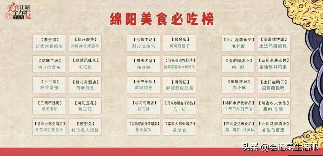 下图就是我找到的关于【绵阳美食必吃榜】的一张图片,是从近300家餐饮中脱疑而出的美食小吃糕点等等,来绵阳,可以作为一些参考!