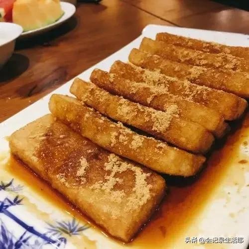 黄糖糍粑是四川一道非常有名的特色小吃,是用糯米经过油炸制作而成,撒上黄豆粉,配上黄糖汁蘸料。吃的时候,裹上黄豆粉的糯米糍粑,在蘸上黄糖汁,吃起来外酥里糯,又甜又香,非常好吃。