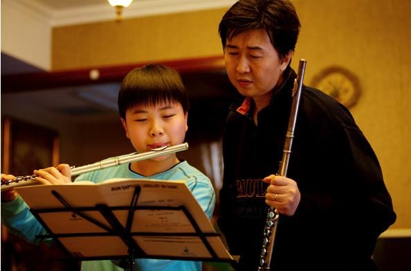 经常缠着爸爸教他吹笛子,
