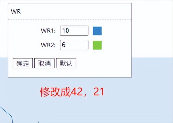 那威廉指标,具体要怎么使用呢?重点内容到了,首先我们来改一下威廉指标的参数 。把其中一条改成快线 21,另一条改成慢线 42。为什么我们要选这两个参数呢?这是因为一个股票从上涨拉升,再到触顶下跌,整个波段过程的生命康波大概是 42 天,那半个生命周期呢,就是 21 天。