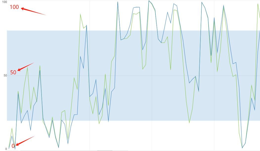 从指标的区域里观察。它的范围是 0 到 100。其中 80 到 100 是超卖区,0 到 20 是超买区。当股价收盘价越高,下方威廉值就越低;当股价收盘价越低,下方威廉指标值就越高。
