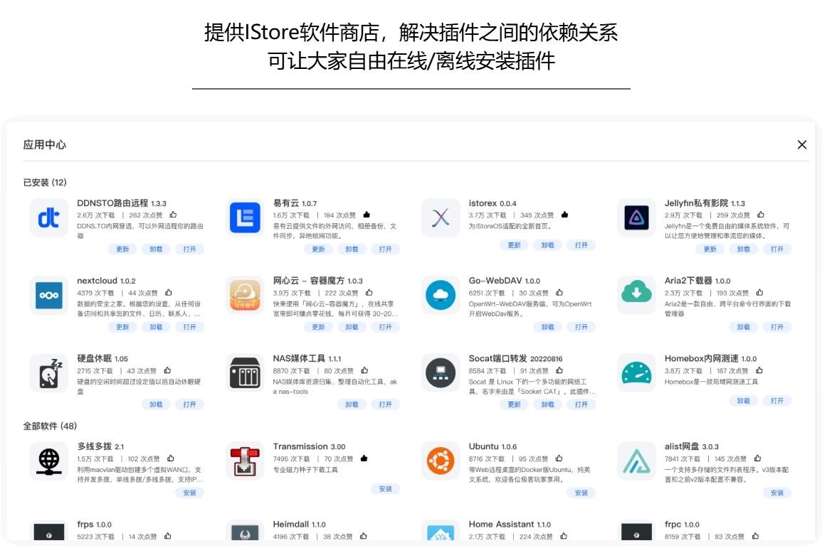 istoreOS,本身是开源的系统,它是来源于OpenWRT,重点是做了很多很多的交互简化。还有一点事不错的,它有自己的istore,也就是应用市场,一些常用的插件都可以找到,而且它还可以安装到openWRT系统上。