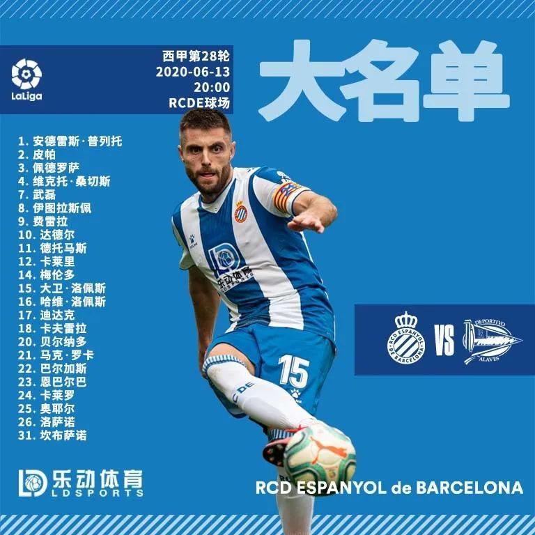 北京时间6月13日20:00,球迷们翘首以盼的西甲联赛正式归来!西甲第28轮,皇家西班牙人主场对阵阿拉维斯。