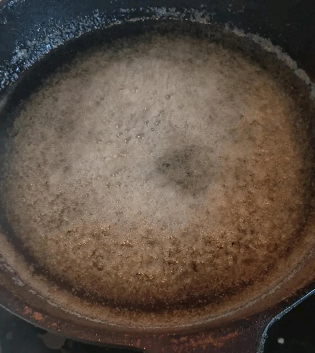 3. 等到糖完全融化变成淡黄色时出现黄色的泡泡,把核桃仁倒进去快速翻炒均匀上色。每一粒核桃仁都包裹上黄色的糖。待糖浆包裹住每个核桃仁后,让每个核桃仁都裹满油光发亮的糖浆。最后等糖浆全部凝固成透明色时就可以出锅了。