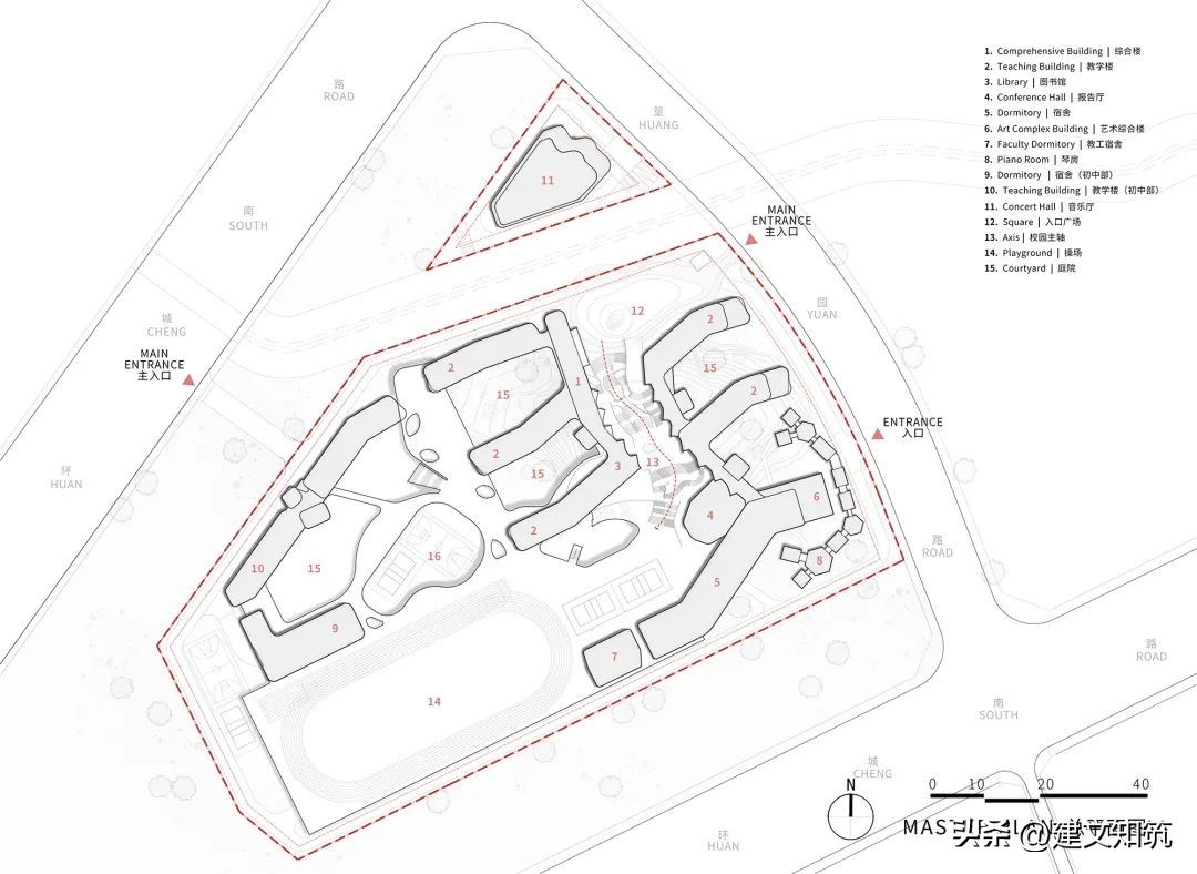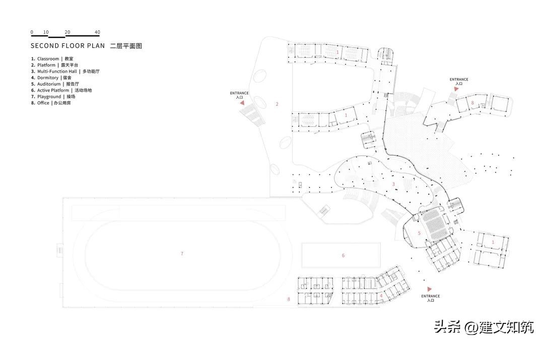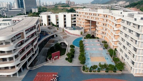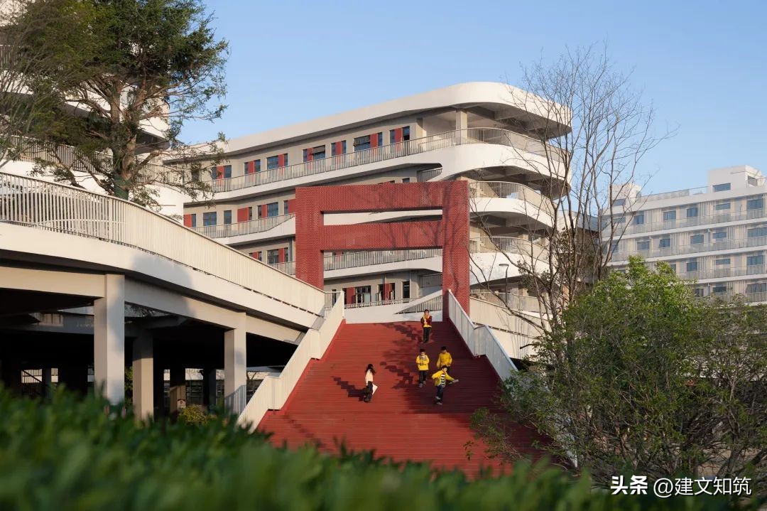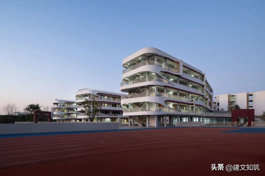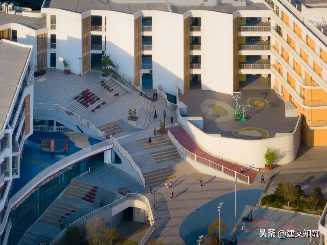 整个校区由中央共享平台分为东西两部分,布局紧凑,东侧为小学部,西侧为初中部,300米运动场位于轴线尽端架空层顶部。设计将现代教育的理念融入设计中,教学空间满足现阶段的教学模式,同时也具备满足未来发展变化的需求,为自由化的艺术活动提供多种可能。