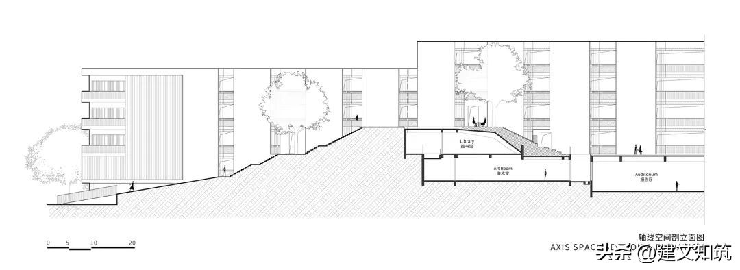 硬地、草坡、灌木、树丛与塑胶坡道有机结合,打破空间的单调沉闷,塑造校园内的独特风景。沿轴线的游行过程中,抬头极目瞭望,远山青翠,空间尽而意无穷。艺术教育在此特定语境中,得到不同的诠释。学生穿梭于艺术聚落,与自然环境对话,在交流中成长。
