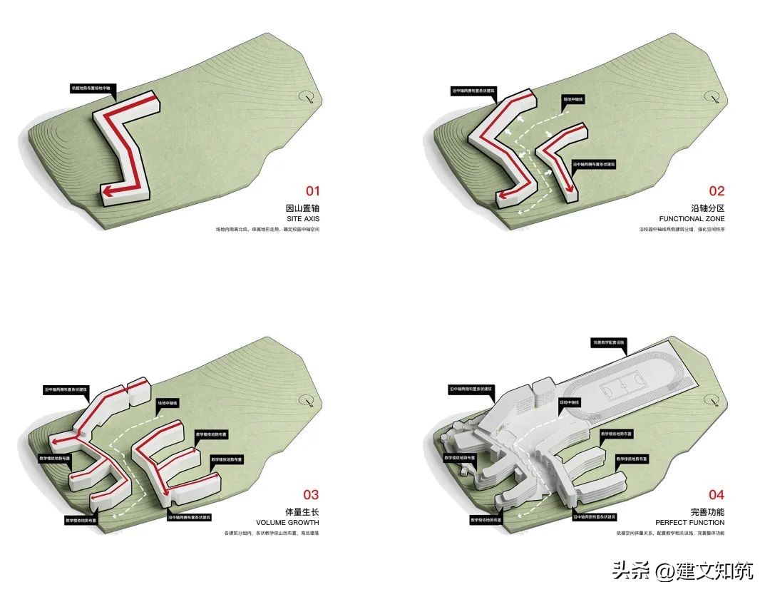 我们的设计构思是将现代教育的需求与因地制宜的规划相互结合,最大程度地保留基地的现状特点,利用地形营造独特的艺术校园空间,同时减少土方量节约造价,自生式演化出建筑方案。我们以“山”为设计理念,教室依山而居,图书馆藏于其中,学生们穿梭其间,尽显无限浪漫的想象。