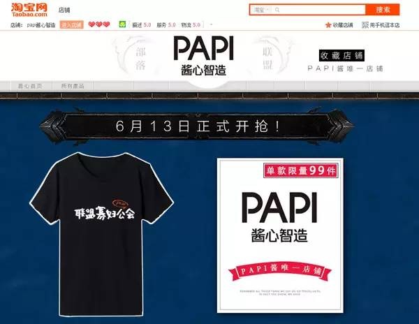 6月,papi酱的淘宝店铺“PAPI酱心智造”上线,首批产品是当时热映的电影《魔兽世界》的主题T恤,三款各自限量99件的T恤很快就被一抢而空。